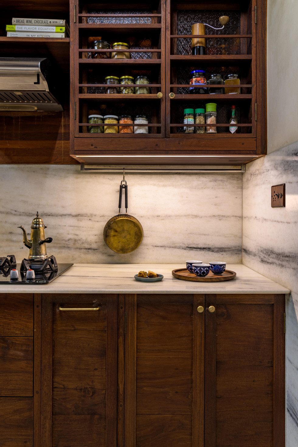 Light Fittiings were sourced from Mumbai’s Chor Bazaar, with some unique, custom-designed marble light fittings fabricated to complement the overall material palette. The vintage aesthetic was balanced with modern touches, like toggle switches and wooden switchboards, which were custom-made to evoke a sense of craftsmanship while integrating seamlessly into the design.