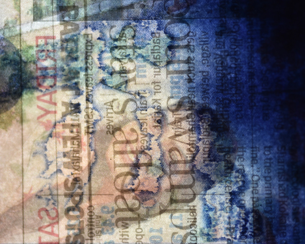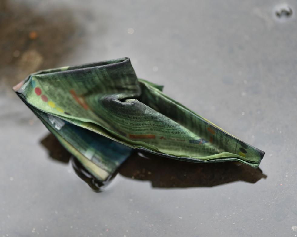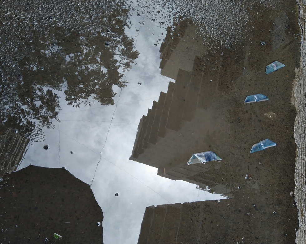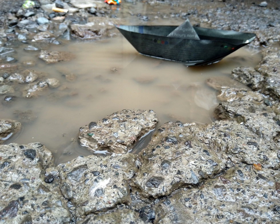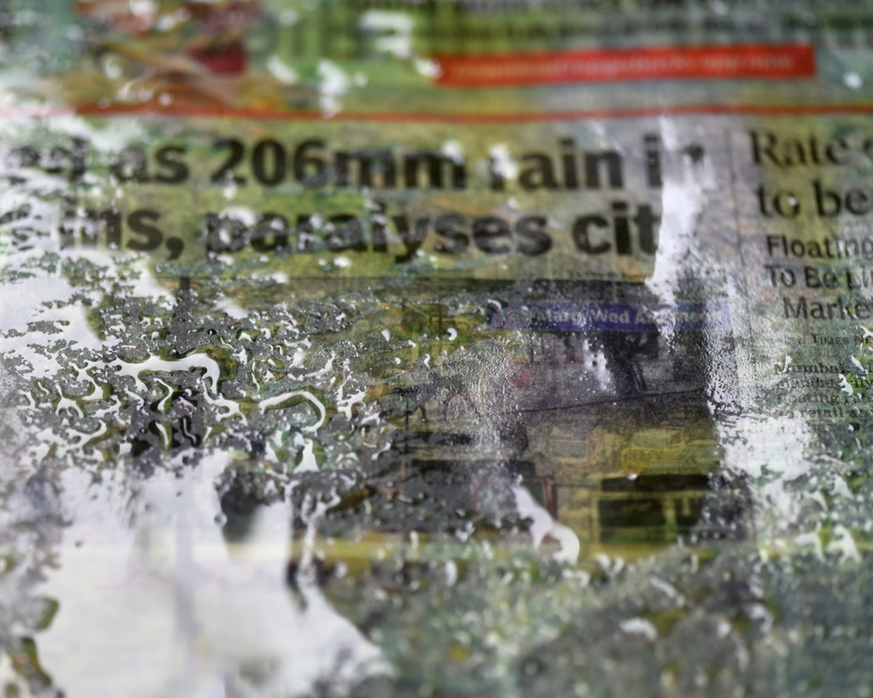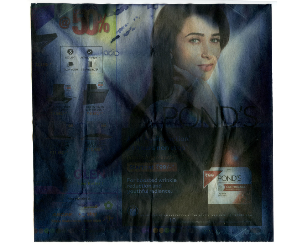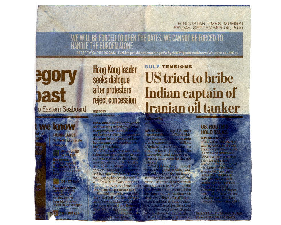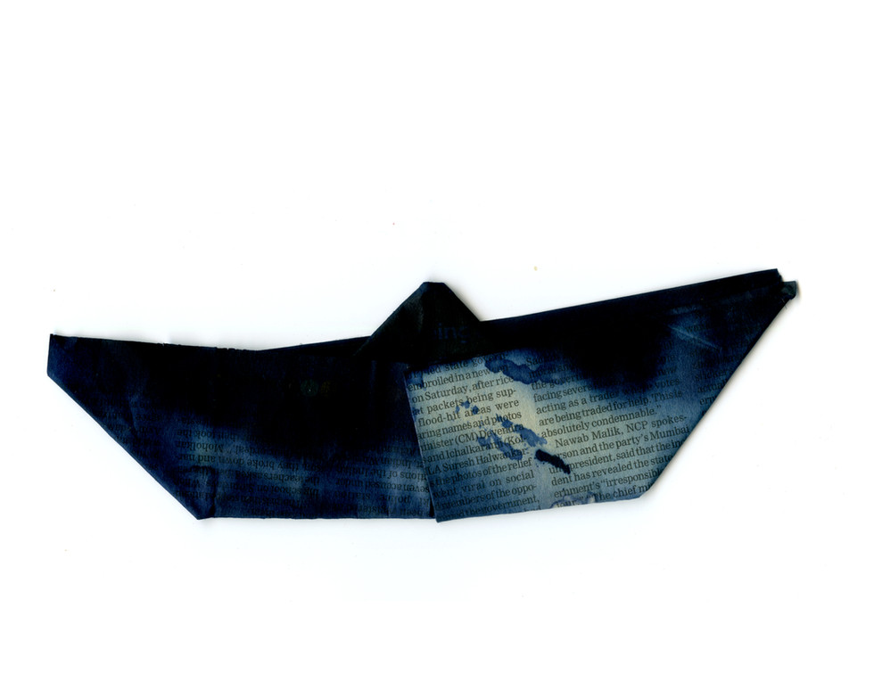 Newspaper coated with photosensitive chemical is folded into boats and set a sail in monsoon waters in Mumbai. The paper boats react with the milieu and fold them into itself. The fold affects and becomes an expression bringing. Anew form I to being in accordance with vectors of different scales and speeds - sun, rain, wind, cars, waste etc. Some get lost, while others survive, pointing to a negotiation in blue-printing. The shades of blue speak back analogically of a presence or absence while building relationships inadvertently. The discoveries add to a sense of construction and ruination of a landscape where images are made through degradation by monsoon water, presenting interesting possibilities through porosity, transparency, reflection and layering. The now is imprinted onto the past, events above and under the fold become simultaneous. Each print is a story, an embodiment of material changes, a landscape. We navigate the archives as we do the landscape.