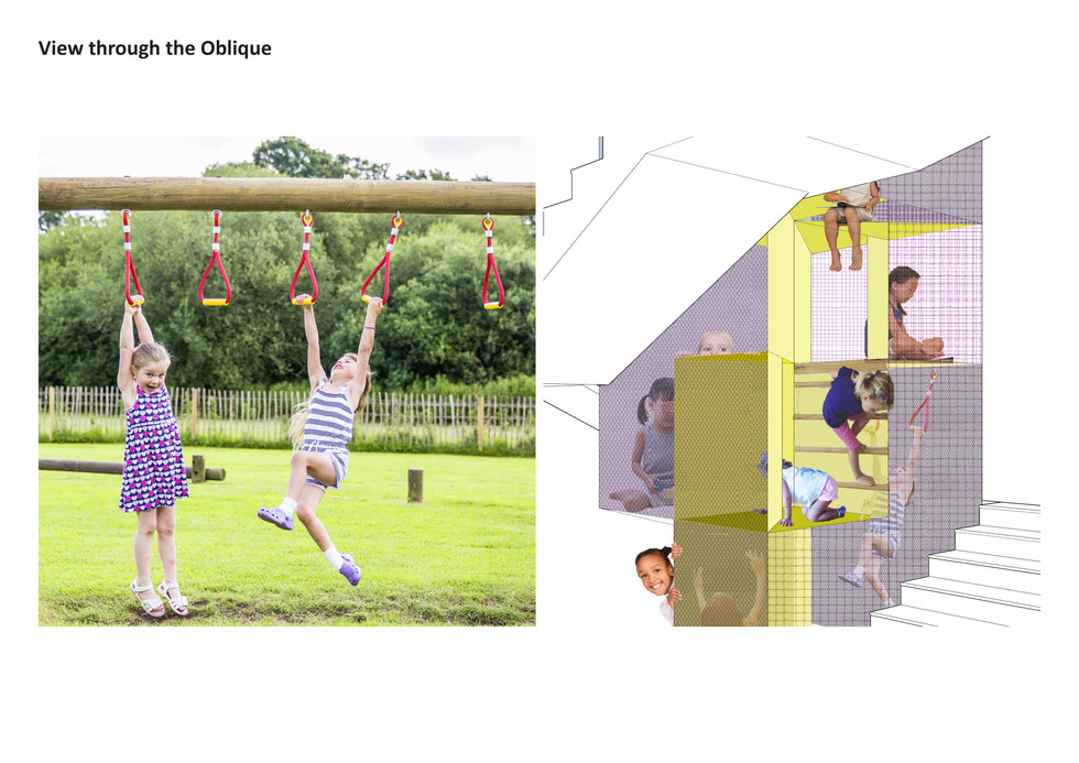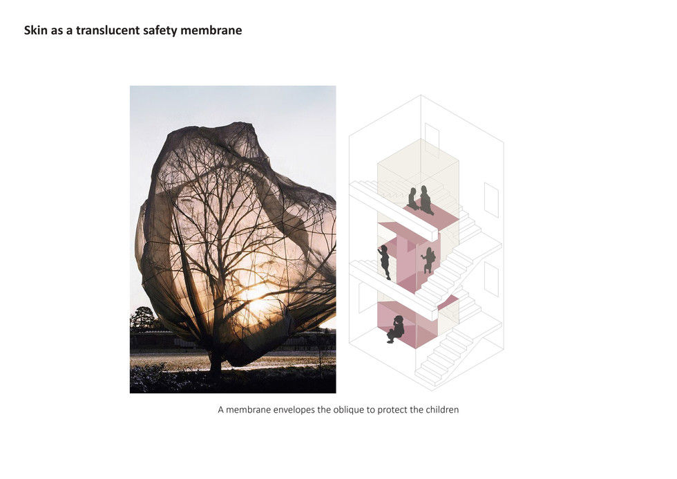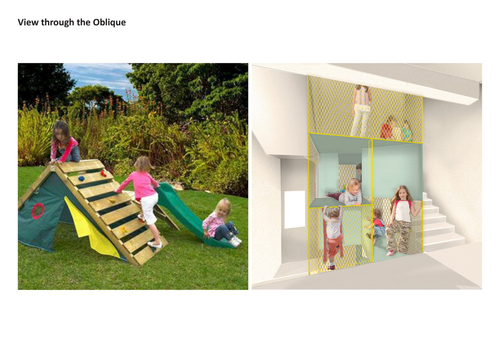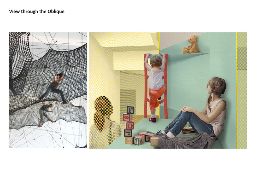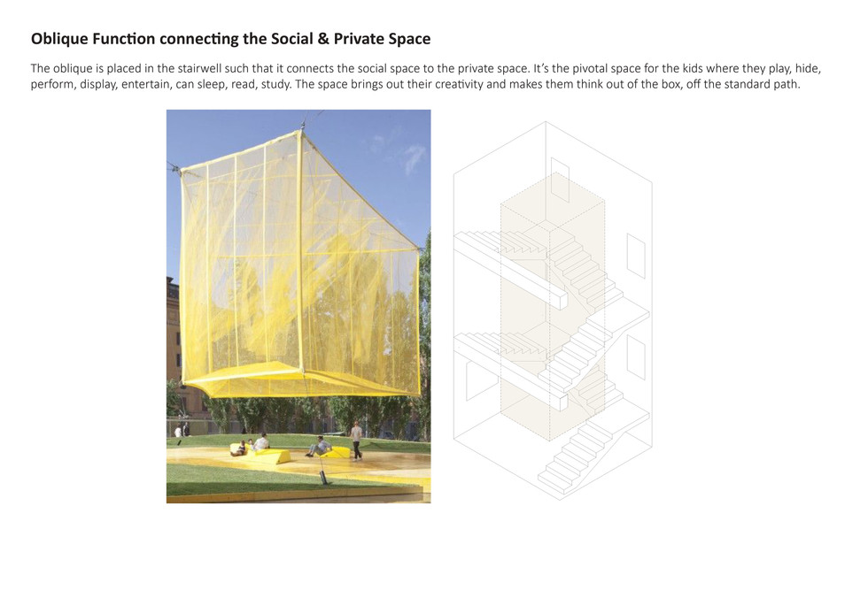The Oblique was created for the kids. It was a space linking the social space on the ground floor to the private rooms on the first floor. Previously occupied by the temple, an alternate playful route / space was created in the stairwell.